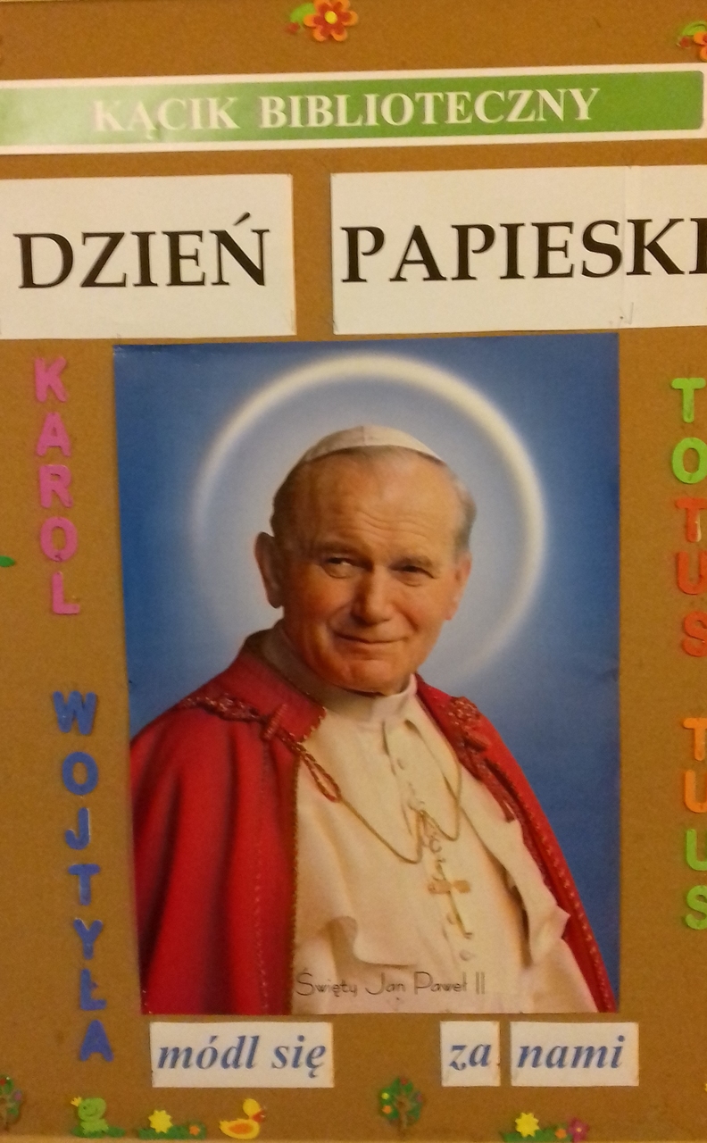 Z racji przypadającej, 16 października kolejnej rocznicy wyboru Karola Wojtyły na stolicę apostolską, polski sejm, w hołdzie papieżowi, ustanowił święto upamiętniające ten dzień. Z tej okazji zachęcam do zapoznania się z wystawką książek opowiadających o Janie Pawle II i napisanych przez Niego. Pamiętajmy o tym wielkim Polaku, który tak dużo uczynił dla naszej ojczyzny. Zapoznajmy się z Jego biografią, a także sięgnijmy po Jego dzieła. Zapraszam zatem do biblioteki:)